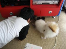 5月・6月と日記の更新をサボってばかりだったから今月は頑張るぞと、思っているのですが、たいした話題がない。。。(;-ω-`A)今日は少し前に撮った写真を載せようと思いますテレビラックの下を覗き込む怪しい2人。マロのボールがテレビラックの下に転がっていっちゃったのです。そのボールを探しているパパリンとマロ。『どの辺に転がっていったの?』(パパリン)『奥の方に転がっていったと思うんだけど。。。』(マロ)っていう、会話が聞こえてきそうですね( *´艸`)パパリンが短い手を伸ばして、必死でボールを取ろうとしてます。その横で見てるだけのマロの姿が笑える(*≧ε≦*)ノ『そっちじゃないよ。もっと右だよっ』と、えらそうに指示してそうだわ(笑´w`) ☆゚+.☆゚+.☆゚+.☆゚+.☆゚+.☆゚+.☆゚+.☆゚+.☆゚+.☆゚+.☆゚+.☆゚+.☆ 寝ているパパリンのズボンのヒモを仲良く1本ずつ『噛み噛み』しているマロゆず。ズボンのヒモを噛む事がマロゆずの間で大ブームマロ、そんな怖い顔で噛まなくても・・・・(´∀`;A もっと怖い顔はこちら目が怖すぎます。。。ヾ( ̄0 ̄; )ノ 『はい、そこファール!!』と言って笛を吹く審判みたい(≧y≦*)いつもの事ながら、私の<例え>はわかりにくい・・・ *ゆずも大人になったので大事な所は隠しておかないとね(∩∀`*)キャッヒモ噛み噛みに飽きたゆず。マロに『おけちゅ攻撃』 ( ̄ω ̄;)こんな下品な攻撃をされても平気なマロって一体・・・・あのぉ、鼻を近づけすぎじゃないですかねぇ?マロさん。。。(゚∀゚lll)oO〇(マロ、スゲェ…)くだらない日記(特に後半部分)を最後まで読んでくれてありがとうございます(。つ∀≦。)