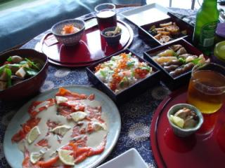 A Happy New Year!2006年だ!やっと、こっちも明けました。昨夜は、FMさんちで年取り=年越しを敢行。美味しいものをたくさん用意していただき、年越し蕎麦もしっかり平らげ、デザートのチーズケーキもペロリ。最高な一年の締めくくりとなった。感謝♪FMさんちにはTVがあり(当然と言えば・・・だが!)カウントダウンの様子を見ながら、お茶で乾杯!そのころには、外のあちこちからハッピーニューイヤーの大音声。思わず、窓を明けて外を伺った。中には、鍋釜!を叩いている輩が・・・!おお、キミタチも祝っているのだねぇ~と、つられて「謹賀新年!」と叫んだのが約一名。・・・そんな具合に、年を越したのだ。それが、昨夜の出来事だ。そして本日。お返し・・・って程ではないがFMさんをお招きした。朝から、頑張ったぞ!何とか間に合ったぜ。ホッ。。。日本に住んでいる方々よりも、もしかしてこういうモノを「恋」しく思うのかもしれないねぇ。昨日電話で母と話したら、「ステーキ焼いて食べた!」だモンなぁ。 ピンボケのもあり・・・それは、ご勘弁願って~左上の一枚は、昨夜の「年越し」のご馳走 by FMさん。このほかに、お雑煮(写真を撮るのを忘れて、喰らってしまった!)・・・それから今回わりと力を入れて拵えた、「茶碗蒸し」!嗚呼、コレも喰らってから、は!ット気付いた。・・・撮ってないぢゃないか!百合根も栗の甘露煮も手にいれられなかったので、思い切って全く違うバージョンで~海老しんじょ&牡蠣の剥き身・・・海鮮風。(+鶏肉・青物・オイスターマッシュルーム=しめじに似ている)実は今回、生まれて初めて作ってみたのだ。・・・茶碗蒸し出汁をとって、溶き卵に混ぜ、味を調え(母の味を思い出しながら)~モンダイは、蒸し方!記憶の糸を辿って、湯煎にかけ・・・時間を見計らいながらも、後は「勘」・・・と言うか、適当に。何とかなるもんだねぇ。FMさんは喜んでくださったようで、嬉しかった。デザートは、ストロベリーチーズケーキ味(?)のアイスに、抹茶ソース(コレも適当に作ってみた)をかけたやつ。中々だったよ。去年ほどではないけれど、まずまずの用意が出来た。気分のモンダイなんだろうけどね、こういうのを頂くと、嗚呼「新年」を迎えたんだ~って思うのだよ。でも暫くは・・・「残り物」をいただく事になるのよね。御節も好いけど~ってのを、思いだすなぁ。何はともあれ、無事に(?)年が越せ、新年を迎えられて良かった良かった。今年一年、無病息災!家内安全!火の用心!元気に、等身大で励んでいこう。さて!今年のテーマは、温故知新!過去を学び尊び、未来に繋げる・・・「初めてのアノ気持ち」を忘れることのないよぅに。それがあれば、やれるぞ!皆様の一年が、素晴しきものとなりますように・・・・・・・。そして、これからも~どうぞ宜しくお願い申し上げます♪Marsworld 敬白