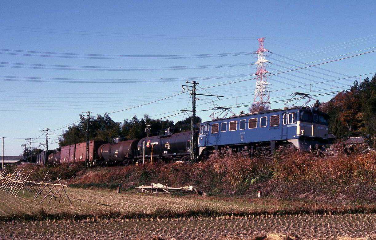 ED75牽引貨物列車:東北本線(国鉄~JR)平成30年1月2日、東北本線黒磯駅における交直流切替が地上方式から車上方式に切り替わりました。母親の田舎が南東北である私からすれば、毎年2~3度は通う東北本線で、黒磯駅と言えば関所のような存在でした。これは、普通列車の乗り換えばかりではなく、必ず停車する急行列車でも、通過となる特急列車にしても駅又は駅構内で受ける儀式であり、このことは幼少の頃から身体に叩き込まれてきたものでした。そんな黒磯駅でしたが、全国で一般的な駅間による車上切替方式へと移行され、車内灯が消え静寂を味わい、パンタの上げ下ろしと同時に電気が点灯してコンプレッサがフル回転して唸るような体験を味わうことができなくなってしまいました。今回は、ED75が牽引する貨物列車に及び黒磯駅に係るものとし、走行区間については東北本線全線としました。昭和58年10月5日 黒磯駅にて ED7583他重連牽引 上り貨物まずは国鉄時代。黒磯駅5番線脇の上り側線に停車中のED75重連牽引の貨物列車。当時だと、EF15かEF60、或いはEF65へのバトンタッチとなるシーンです。本来なら出発待機は直流機が連結されていますが、到着してすぐに撮影したものかもしれません。83号機は、民営化直前の昭和62年2月6日付で廃車となっています。昭和58年10月5日 黒磯駅にて ED7578これも同日に黒磯駅で撮影した78号機。おそらく、上の写真の側線のさらに隣の留置線で留置中の78号機と思われます。本来、交流機の留置場所は仙台寄りにあり、ここに交流機を留置しているところはあまり見たことが無いような気がします。所属札が「長」になっており、当時の長町機関区所属を表しているのも懐かしい。78号機も、民営化直前の昭和62年2月6日付で廃車となっています。昭和59年10月14日 矢吹~泉崎間にて ED7516他重連牽引 高速貨物列車59・2の貨物大合理化後に撮影したものですが、先頭は若番の16号機であり、運良く即廃車を免れたカマでしょうか?後に連なるはコキ50000を中心とした高速貨物列車で、車掌車連結廃止前ということもあり、コキフ50000が連結されています。16号機も、民営化直前の昭和62年2月7日付で廃車となっています。昭和59年10月14日 矢吹~泉崎間にて ED75704牽引 ワム貨物列車こちらも同日に撮影したもの。本来なら奥羽本線や羽越本線でしか見ることのできなかった700番台が牽引しています。59・2大合理化で初期車を大量に整理したため、車齢の若い700番台も広域で異動したようです。後まで写っていないので詳細は分かりませんが、ワム80000ばかり組成されていますので、紙輸送の列車かもしれません。704号機は、JR貨物に継承され、平成8年3月29日付で廃車となっています。昭和62年8月 撮影場所不詳(多分渋民辺り) ED75143他重連牽引 コンテナ列車こちらはJR化間もない頃に撮影した写真で、かなり北部になります。列車は短編成ながら重連牽引となっており、先頭の143号機にはJRマークが貼ってあります。殆どのカマはJR移行時にステッカーが貼られたと思っていたのですが、次位の機関車(カマ番不明)には貼られていないようです。編成の中間にはコキフ50000が連結されていますが、既に一部の長距離列車?を除いて列車掛の乗務は廃止されており、しばらくの間はコキ代用として使用されていたようです。平成2年7月1日 高久~黒磯間にて ED75143牽引 コンテナ貨物列車さらに南下して高久駅に近いところ。今の輸送と同じようなスタイルですが、この列車にはまだコキフが連結されているようです。長距離の直行コンテナ列車では、少しの間だけ車掌業務が残っていたような話を聞いたことがあります。143号機は、JR貨物に継承され、平成20年4月1日付で廃車となっています。平成2年7月1日 矢吹~泉崎間にて ED75120牽引 車扱い貨物列車再び南部地域での撮影。ワムとタンク車が連結された短編成の車扱い貨物列車のようです。JR化直後はまだ車扱いの特殊なタンク車を使用した列車が多数設定されていましたが、徐々にトラック輸送への切替が進み、今では石油類やごく一部を除いて殆どが廃止又はコンテナ輸送へと切り替えられてしまいました。120号機は、JR貨物に継承され、平成12年8月2日付で廃車となっています。平成23年7月8日 須賀川~安積永盛間にて ED751029牽引 コンテナ貨物列車こちらは今と全く同じようなスタイルのコンテナ列車です。1000番台を使用していますが既にP型の役割は終わっていますので、一般型と700番台は共通であったと思います。それでもまだEH500は製造数が少なく、ED75が主力の時代でした。1029号機は、JR貨物に継承され、平成18年3月30日付で廃車となっています。EH500が台頭するまでは殆どの列車が黒磯駅で機関車交換を行い、EH500へ完全に移行された後もEH500の走行距離を抑えるため交換作業を残していました。しかし、津軽海峡線における運用をEH800に移行したことによりその調整も解除され、EH500のスルー運転化が可能に。今回の切替方式の移行もこのことによって実現できたものと思