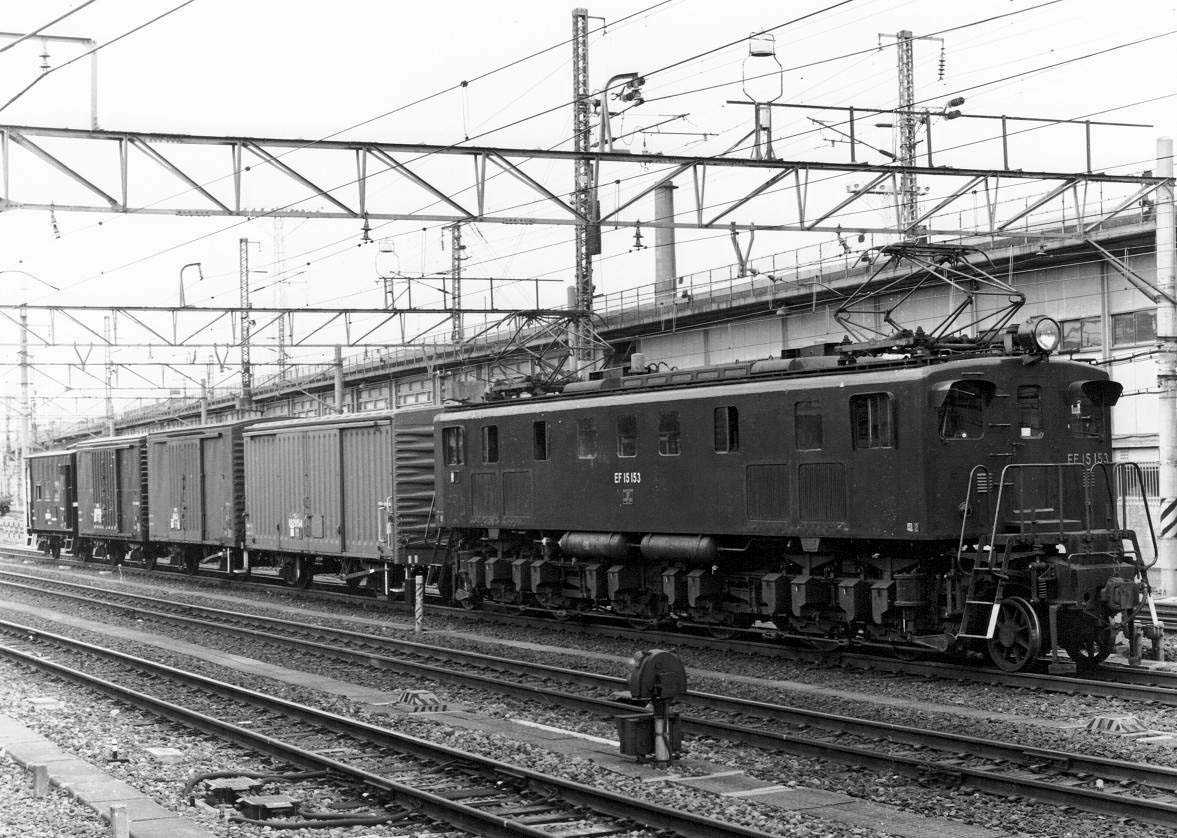 国鉄旧型電機 EF1545(八王子機関区)EF15シリーズ、今回は八王子機関区所属の45号機です。昭和54年頃? 撮影場所不明当時は駅撮りのスナップの記録を取っていないので、全くもって不明な写真です。別編集した際、東京機関区の所属で上野駅で撮影したものとばかり思っていたのですが、同機は東京機関区に所属した経緯は認められず、上野駅に居る可能性はないと判断しました。では何処で撮影したのか?私が良く駅撮りをした記憶だとすると品川駅か東京駅となりますが、ここでも同機が貨物列車をホームまで引いてくる可能性はありません。だとすれば、新宿駅か八王子駅くらいしか該当駅は無いのですが、新宿や八王子と言うのは撮影で訪れたのがほんの数回で、まったく記憶に甦ってきません。何でこんなドアップで撮っているのかと言えば、この頃はFD300mmを手持ちで振り回していて、何でもかんでも望遠で撮っていたんです。かなり無理がありますし、ブレちゃってます。周りの状況が判ら無い分、分析するのが難しい記録となってしまいました。45号機昭和26年12月26日 川崎車両製 沼津機関区昭和55年 3月35日 廃車 八王子機関区
