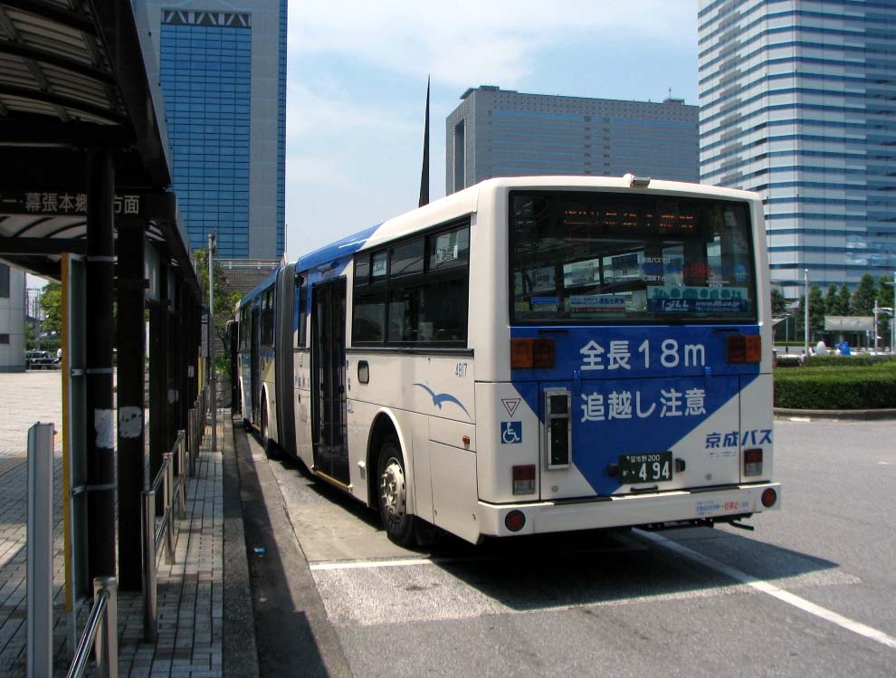 京成バス:富士重工・ボルボ製 連節バス今回はバスネタです。現在では、主要都市で何か所かで導入されている連節バスですが、その昔はかなり限定された場所にしか存在しませんでした。古くは京王バスや国鉄などでトレーラーバスがあったようで、本格的な連節バスが導入されたのは昭和60年に茨城県で開催された国際科学技術博覧会(つくば万博)のようです。その頃はバスに興味があったわけではないため、実車を何台も見ていたものの、写真1枚すら撮っていませんでした。万博で使用された100台の連節バスは、閉幕後に80台がオーストラリアへ輸出され、一部が東京空港交通でリムジンバスに使用されていました。その事情も記憶にあるのですが、当時は今のように情報が発達していたわけでもなく、行動を起こす前に消え去っていました。一般路線用として初めて連節バスを導入したのが京成バス。急増する利用者の輸送に充てるため、幕張新都心に10台が導入されたそうです。そのこと自体も全然興味を持たなかったのですが、バスコレクションの登場以来、バスに興味を持つようになり、さらにこの初代連節バスが引退するという情報が入ったため、他の用事と合わせて撮影することができました。※撮影は、平成20年7月12日 海浜幕張駅前ロータリーにて。そもそも、どの路線にどのくらいの頻度で走っているのかさえ知りません。そんな中、目の前にいたバスを長い信号待ちの間に行かれてしまい、撮り逃してしまいました。あきらめて交差点の日陰で一服していたら再び現れ、やっと捉えることができたのがこの1枚です。停車中の写真を撮ってから折り返し間合いに道路~歩道橋を走り込み、安全な高い場所から撮影することができました。もう1本くらい撮りたかったのですが、とにかく猛暑で日陰が無く、どのタイミングで来るのかも分からず、娘の安全も考慮してこの日は諦めました。もう1回くらいは撮影に行こうと思っていたところ、この写真を撮って間もなく運用から外れてしまったようで、結局この2カットのみに終わってしまいました。引退の理由が都心の排ガス規制にあったようで、導入から10年で引退となりました。しかし、バスならまだ使えますので、譲渡が検討されていたようです。当時は確か鹿児島へ行くと言っていたようなのですが、どうも計画は頓挫してしまったようです。最近になって、JRバス関東に譲渡され白河の研修センター送迎に当たっていることを知りました。JRバス塗装の同車はとても中古とは思えないキレイさで、これはちょっと行ってみたくなりました。しかし、その後に新型の連接車が増備され、既に一部が廃車されてしまったそうです。