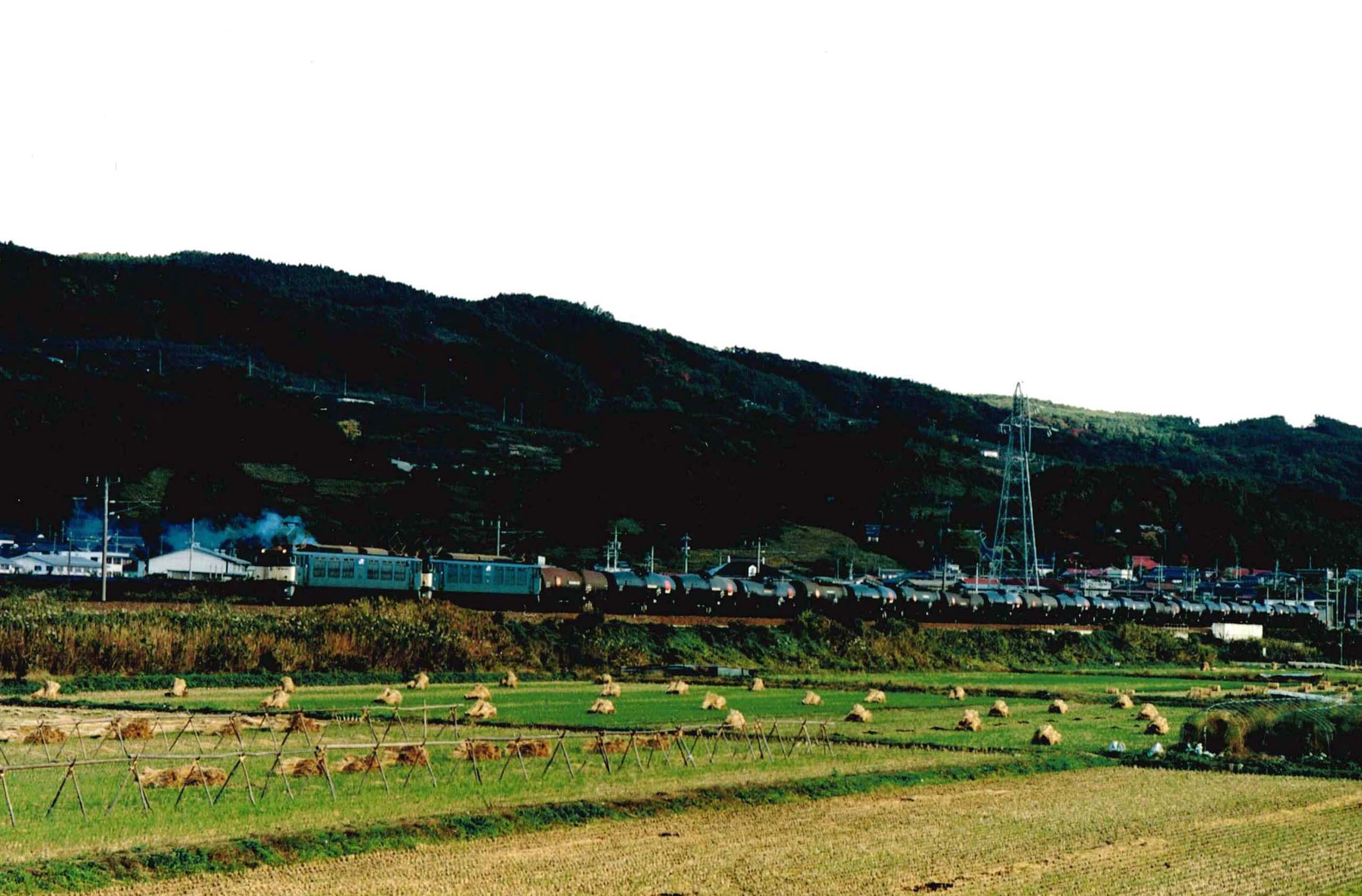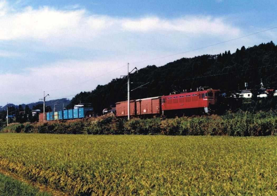 ED75700番台牽引貨物列車:奥羽本線今回は1枚のみですが、奥羽本線で撮影したED75700番台牽引の貨物列車です。昭和61年9月9日 奥羽本線(撮影地不詳) ED75700番台牽引 貨物列車撮影場所が不詳ですが、多分、鷹ノ巣辺りだと思います。寝台特急「日本海」の写真を撮るために構えていた際に通り掛かったもので、編成は短く、ワム80000やタキ・トラ・コキが少しずつ連なる区間貨物っぽいです。59・2改正を過ぎていますので、既に緩急車の連結もなく、ローカル然とした編成ですが、さらに時代が進むと、辛うじて残っていた駅扱い・車扱いも殆ど廃止され、このような編成も消えていくことになります。国鉄時代末期のローカル貨物の最後の姿です。