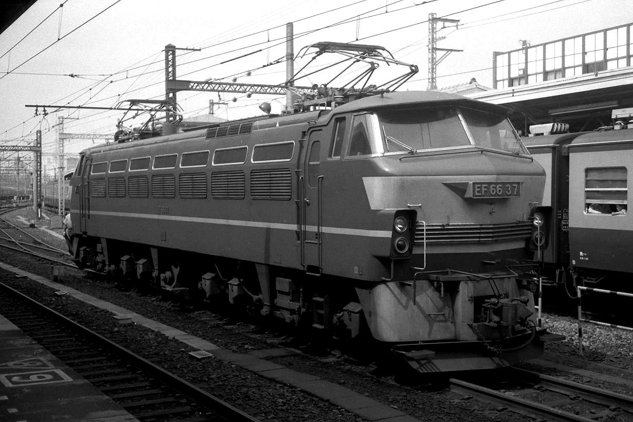 国鉄 直流型電気機関車:EF6637EF66シリーズで、37号機です。私が撮ったEF66の写真の中でも一番古いものかもしれません。昭和53年頃 品川にて EF6637停まっている位置は品川客車区の洗浄線入換の引上げ線ですが、品川駅の貨物発着線から東京機関区への入出庫の際にここで折り返しを行っていたようです。EF58が停まっているところには良く出くわしましたが、EF66は殆ど見た記憶がありません。バックに停車している113系非冷房車の窓雰囲気も懐かしいですし、これから品川界隈は大きく変貌しますので、もはや遠い過去の記録となってしまいました。37号機は、2010年3月31日に除籍になったそうです。