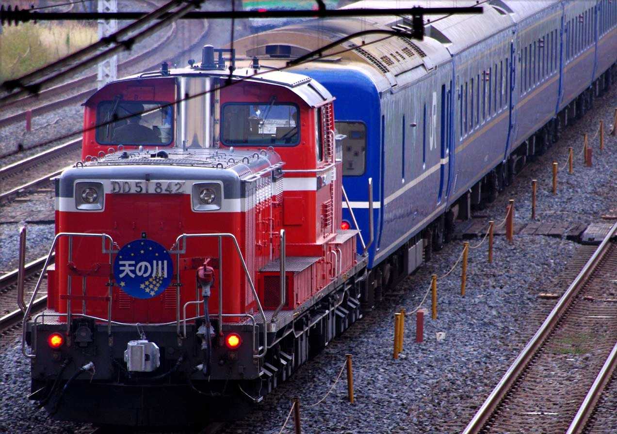 団体列車:寝台急行「天の川」で行くあきたの旅平成25年11月2日、東京駅からDD51が牽引するブルトレを運転するという、極めて異例の団体列車が運転されました。正式団体名称は、『DD51に魅かれて 寝台急行「天の川」で行くあきたの旅』。あらかじめパンフレット等で時間の告知はされていましたが、ダイヤ情報を含む雑誌等には公開されなかったため、混乱した方も多くいらっしゃったのではないでしょうか?私もそのうちの一人です。地元ではまずDD51牽引の列車を見ることはなく、これは私が地元で鉄道写真を撮り始めた昭和40年代後半以降からの歴史であり、上野駅へ成田線からの乗り入れがあった程度しか見たことがありません。2011年に『DD51842:快速「烏山山あげ祭り」』が2013年に2日間運転された訓練運転があったくらいです。もっとも、その訓練運転もこのDD51牽引の臨時列車を運転するためのもの(普段DD51の機関士が24系を牽引したことがない、或いは田端区機関士の緊急対応用)ではないかと思っています。そんなことで、不確実な夜より明るいうちの回送を狙いたいということで、スノ・ラビさんから情報を得てなんとか撮影することができました。※撮影は、平成25年11月2日です。DD51842 回9842レ 団体列車「天の川」送込み回送団体旅行の告知絵柄どおり、得体の知れないへッドマークを取り付けていました。現役時代の急行「天の川」はヘッドマークなんかもちろんありませんし、24系も使用したことはありません。普段は貨物線を行く列車を後ろ向きメインで撮ることがなく、撮影場所の設定に困りました。結果的に強引なアングルになってしまいましたが、ヘッドマークメインということで妥協。スピードが非常に遅かったため、なんとか助かりました。本番は19時ころの通過。30分以上前から準備万端整えて余裕をかましていたのですが・・・出掛けに大宮時間を赤羽通過と勘違いしてしまい、目の前で撮り逃すという大失態。なので、残念ながら画像はありません。EF651115牽引 回9842レちなみに、送込み回送はPF1115号機牽引のプッシュ・プルとなりました。本運転には補機は連結されず、高崎からはEF81が牽引しています。今回、なぜ急行「天の川」としたのか、上野発とせずにわざわざ山手貨物線経由の東京発としたのか、なぜこの区間で牽引実績の皆無だったDD51の牽引としたのか、謎だらけの団体列車でした。EF641000番台牽引 20系寝台客車:寝台急行「天の川」EF58牽引 20系寝台客車:寝台急行「天の川」EF58牽引 10系寝台客車:寝台急行「天の川」