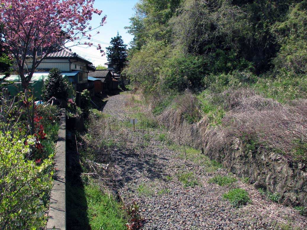 覗いてみると不自然な路盤。そう、日立電鉄の廃線跡でした。道路として活用できそうなほどキレイな砂利道になっています。