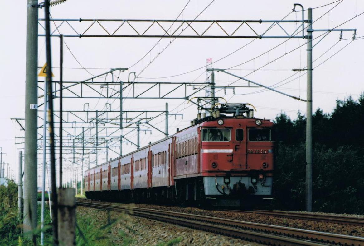 昔は通勤時間帯の長大編成に客車が使用されていましたので、ED76500が活躍する場面は多く見られたようですが、711系の増備や721系の誕生と電車の両数が増加してくると、年式の新しい50系客車とはいえ、たちまち運用から外されるようになり、晩年は通勤時間帯にホンの数本が残るのみとなってしまいました。