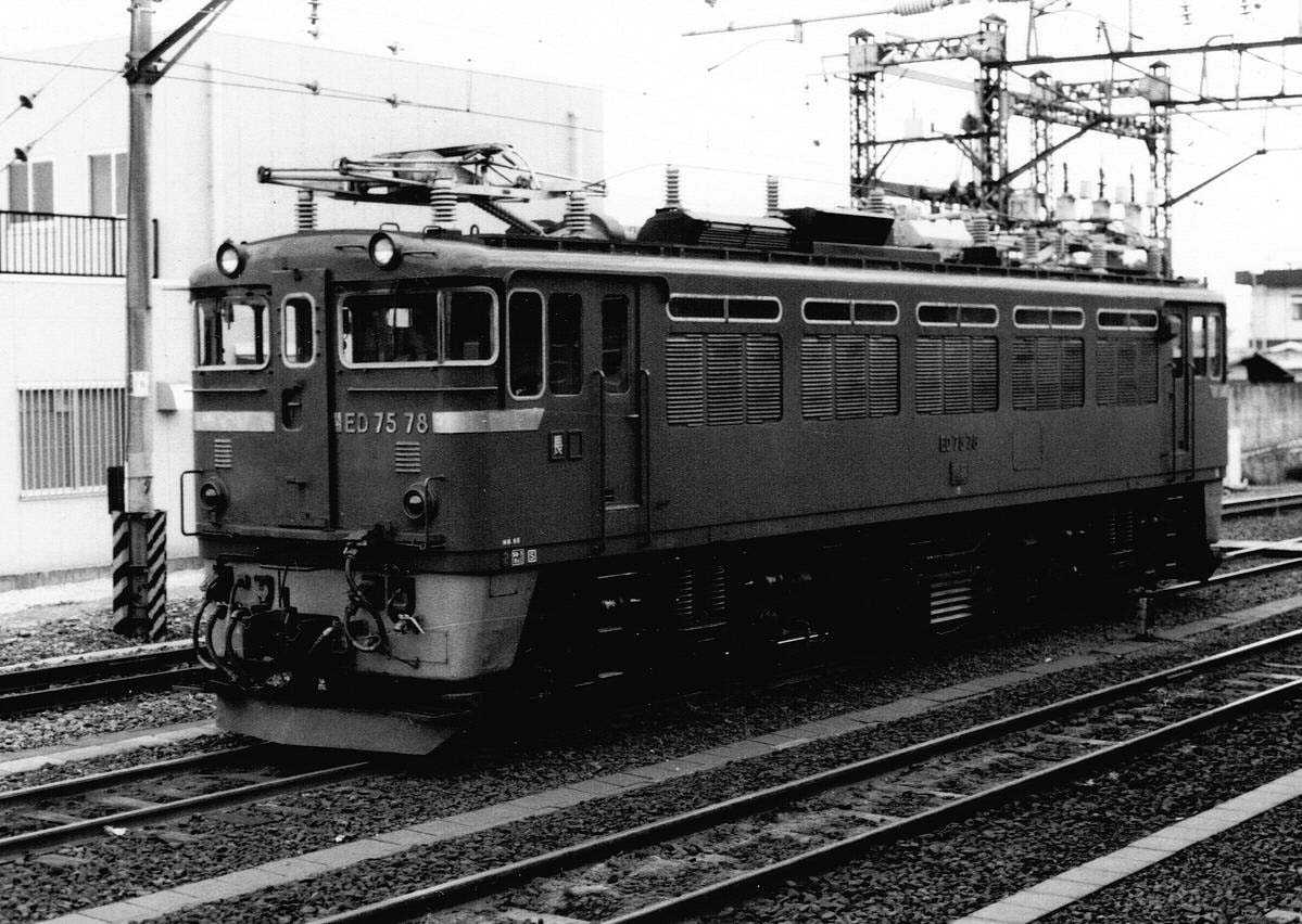 まずは国鉄時代。黒磯駅5番線脇の上り側線に停車中のED75重連牽引の貨物列車。