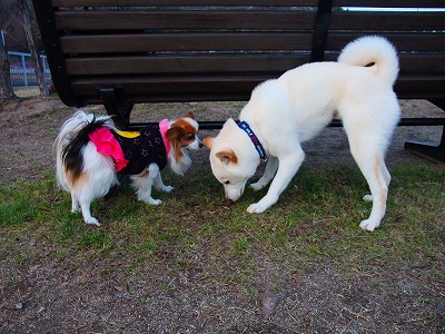 白馬から高速で帰路する時に何回かのSAやPAで休憩のうち、ドッグランが設置されている菩提寺SAでの画像です~怖かったワンッ、早く家へ帰ろうよ~マリィとラムの性格の違いに確然と差が大きいでしょう白柴犬は、とても元気で遊びまわり、しかもフレンドリーでサービス精神が旺盛なのでマリィと気が合い、上手に挨拶が出来ているが・・・ラムは、もう超ビビリで震えながら固まっているのが、ちょっとウケちゃったねん全然、犬社会に馴染めないのはひょっとしたら、ラムの性格だったかもね。元からマイペースだし、マリィしか遊べないワン見知りやしね・・・まっ、マリィとラムの性格の違いにこちらは退屈にならないからよしとしょうっと