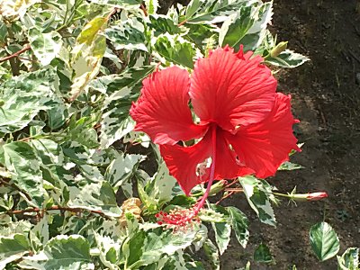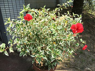 赤い大きな花が白っぽい斑入りの葉に映えますね。
