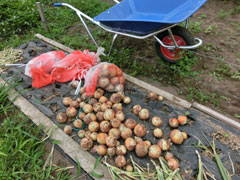 ナスとキュウリとトマトです。今年は雨が多く、野菜も良く育っています。キュウリは食べ切れないくらい・・・トマトとナスはようやく取れ始めたところです。収穫したタマネギは大小さまざまですが、小さいのが多く、なかなかうまく育てられません。