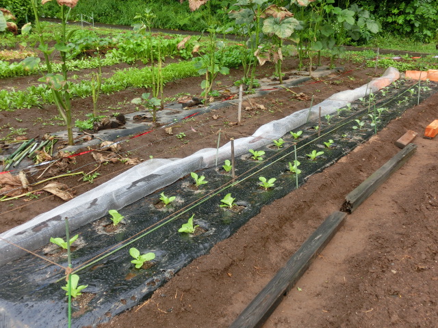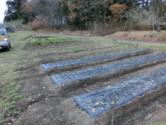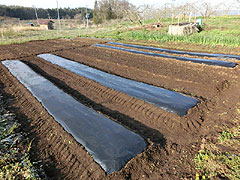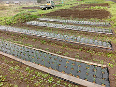 先日畑を耕したので、畝づくりをしました。畝に4列だけビニールマルチを掛け、トマト・キュウリ・ナスなどの苗を植える予定です。マルチをしない畝には葉物の野菜、ホウレンソウ・小カブ・小松菜・京菜・春菊などの種蒔きをしました。