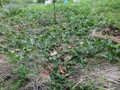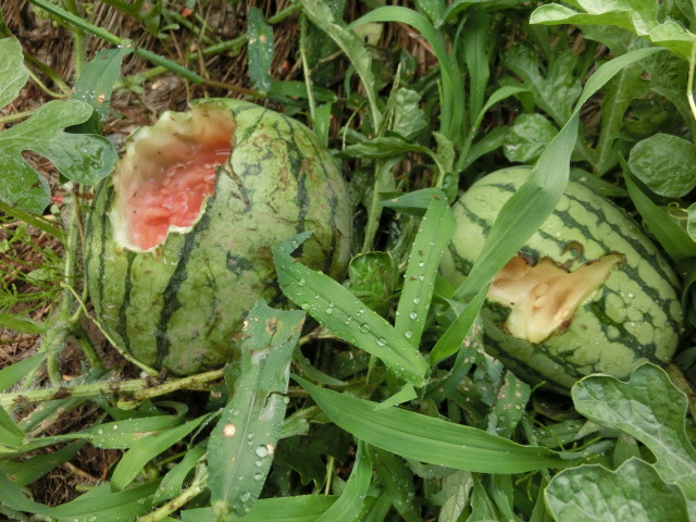 残念な事に、スイカが全滅です。順調にたくさんのスイカが育っていたのですが、今日畑に行ってみたら小さいスイカまで1ヶ残らず何者かの動物に食べられてしまいました。見事にきれいさっぱりやられてしまいましたので、ただただ唖然とするばかりです。タヌキかハクビシンか、それとも熊か…?