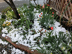 5cm程の積雪です!チューリップが咲き、桜の花が満開のこの時期になってからの雪は見たことがありませんでした。農作物などへの影響がないといいのですが……