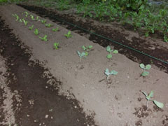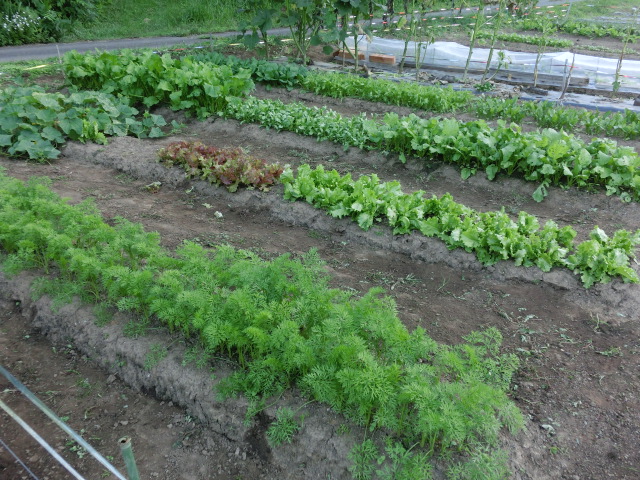 いろんな野菜を作っています。ニンジン、ルッコラ、レタス、野沢菜、ホウレンソウ、京菜、オクラ、小松菜、小カブ、春菊、そして、地這いキュウリも……このほかに大根(4種類)、白菜、キャベツ、二十日大根、タマネギの苗も作っています。今年は思ったより順調に育っています!