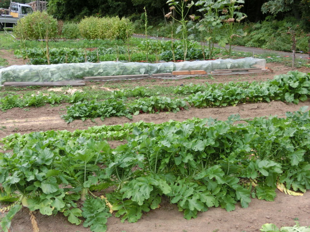 野菜畑を畑の両側から写真に撮りました。今はいろんな野菜が大きく育ち、食べるのが野菜の成長に追い付けません。頑張って食べないと、もうすぐ食べられなくなる野菜が出てきそうです。贅沢な話ですよね……今は野菜も買えば高いというから、ありがたい事ですね。こうしていくらでも食べられるのですから……