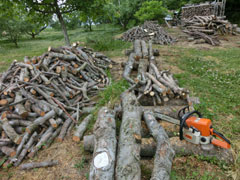 ストーブの薪用にリンゴの木をたくさんいただいていたのですが、チェーンソーで切るのが大変で、なかなか手付かずでした。ようやく切り始め、あと少しまでになったところで、“STIHL”のチェーンソーがダウンしてしまいました。この後、切った木を積まなければならないし、大変な作業です……