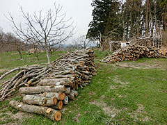 りんごの木の薪がたくさん集まりました。今年もりんごの木の剪定が終わったりんご農家からりんごの木の薪をいただきました。これから休みの日など時間を取って40cmくらいの長さに切り揃えてから薪を積まなければなりません。この作業も大変なんです……