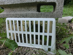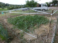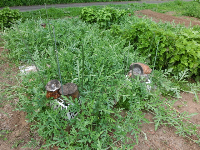 スイカがたくさん実を付け始めました。昨年は全部野生動物(たぶんハクビシン)に食べられたので、今年は百円ショップでプラスチックのカゴを買い、それをスイカにかぶせました。カゴの上にブロックや丸太を乗せ、四隅を棒で固定しました。美味しいスイカが食べられるかはこれからが野生動物との勝負です。