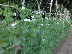 絹さやえんどうの花が咲き始めました。あと少しで美味しいえんどうのみそ汁などが食べられます。絹さやはさやの中の種が小さく、食べやすいんです。今年はたくさん植えすぎたので、誰かに食べてもらおうと思っています。