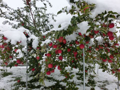 今朝起きたら15cm程の積雪があり、びっくりしました。りんごの「ふじ」はまだまだ収穫前のものが多く、赤いりんごにこれだけの大雪はなかなか見ることが出来ず、きれいなのですが、雪の重みで枝が折れないか心配です。