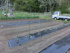 ジャガイモの土寄せをしました。トマトやキュウリ、ナスなどに霜よけと風よけのビニール袋をかぶせていたのですが、もう気候もよくなってきたので今日取り、トマトの支柱をつくりました。