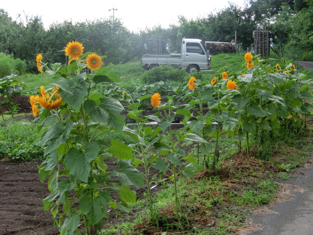 畑にひまわりとコスモスが昨年のこぼれ種で咲いています。畑仕事をしながら時々眺めては楽しんでいます。
