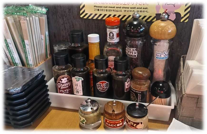 塩・タレ等、調味料が14種類くらいテーブルに用意されてます。いろいろ試しながら食べられて