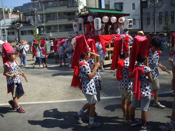 暑かったですね日焼け対策もせずに飛び出るんじゃなかったわ2日続けて 太鼓とか 獅子舞とか おみこしとか 笠おどりが町をねりあるきますうちの子は念願の太鼓で参加学校が終わる時間じゃ祭りの準備が間に合わないでしょうと言うことで、先生に早く帰らせて下さいとあらかじめ言ってあったのでとても早く帰って来て余裕で間に合いました。なんかみんなより早すぎて目立ってしまったそうな・・・しかし 同じクラスでも出発ぎりぎりに来た子も居て馴れない着替えをその場でやってあげたのですけど焦った~! タスキの結び方がよくわからんほどけないようにはきつめに結んであげたけど見た目が変かも・・・年に一回のことなので写真をいっぱい撮ってあげたかったのですが合間に家の用事を済ませて 行ったり来たりしてたら肝心の太鼓のお当番は見のがしてしまったようですすごくすごく歩いて 水とお茶を大量に飲んで汗もだらだらかきました帰ったらもう なんもせずに寝転びたかったでも次の日も同じ衣装を着るからお洗濯・・・ごはん作る暇もなかった祭りの途中休憩で おにぎりの軽食をいただいていたので・・・カップ麺で(^^ゞ すまぬよろこんで食べてくれるからいっか~!寝る寸前までばたばたして寝転ぶことはかなわなかったのである次の日は日焼け対策ばっちりして また がんばろう