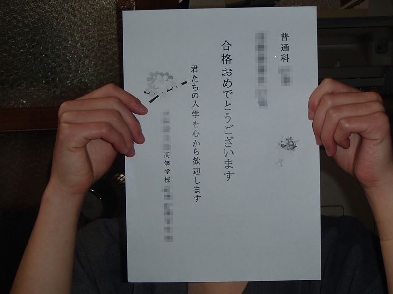 今日は公立の高校の合格発表の日期待と不安とを抱えながら10時ぴったりに志望校に見に行って参りました。母はあまりに恐ろしくて掲示板を見ることができなかったんですが、息子がじっと見てひとこと「んな、馬鹿な・・・」それってなに?それはどういう意味??わからんやんとパニクっていたのですがどうやら・・・ありましたありましたようちの子の受験番号いやぁ信じられなくて3回も掲示板を見直しに行く息子でした。無事に高校生になれるようです。やったね。ほんまによく頑張った!!