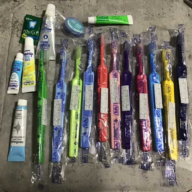 試供品サイズの歯磨き粉5個とミニフロスとガム1粒とテペの歯ブラシ1本