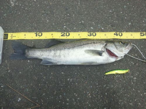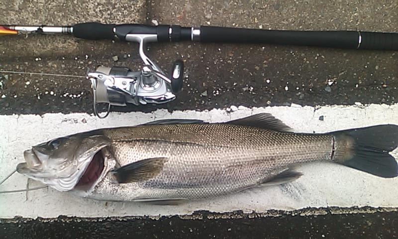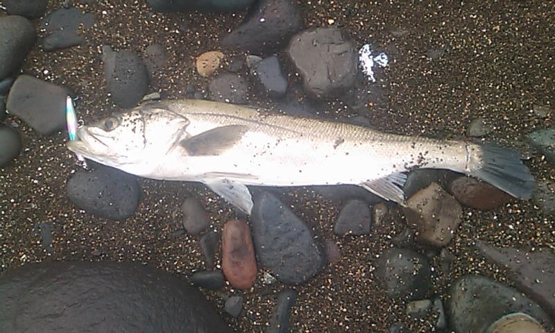週末にギックリ腰をやってしまって、今日は釣りは無しかな~と思い、ビーチを散歩。しかし我慢ができず、「チョットだけ。」と、結局竿を出してしまった。「時間的に釣れないかな~。」と思っていると、ぐぐっと手応え。「来たぜ!」ゴリ巻きで足元に引寄せた。 チョット小さいですが、最近なかなか釣りに行けてなかったので、久々のシーバスでやっぱり嬉しいですね。