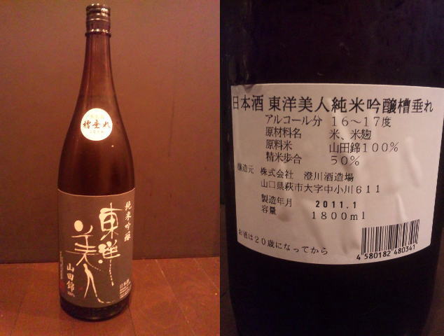 最近お気に入りの「東洋美人」ココの「純米吟醸・山田錦」がウマイんですよ~。今のところ一番好きなお酒かも。キレイで柔らかく、透明な旨みと膨らみ、冷から飲み始めて、徐々に温度が上がっていくと、ツルッツルの滑らかさが出てくる。美味い。