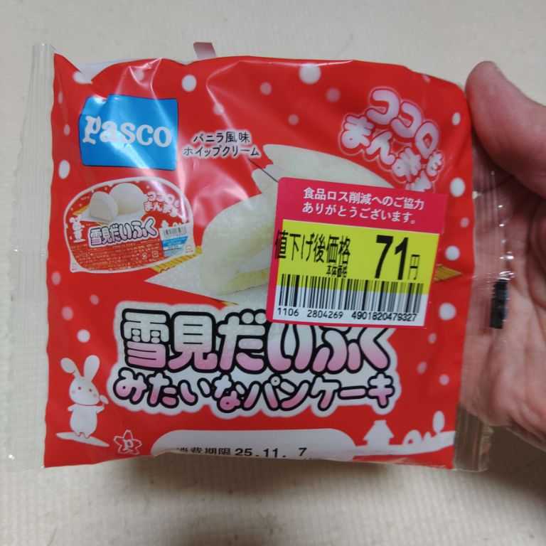 【食べた日:2025年(令和7年)11月6日(木)】 ※ 公式HPより ロッテの人気アイス「雪見だいふく」を再現したパンケーキ! 国産小麦100%のもちっと食感のパンケーキ生地に、バニラ風味のホイップクリームと求肥を挟みました。 「雪見だいふく」のコクのあるバニラアイスと弾むぷにぷに食感のおもちを再現したパンケーキです。 ※ パスコ 雪見だいふくみたいなパンケーキ(77円)