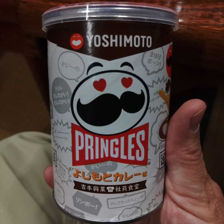 【食べた日:2025年(令和7年)11月3日(月・文化の日)】 ※ 公式HPより 世界140か国以上で販売されているポテトチップスの代表ブランド「プリングルズ」は、世の中に笑顔と笑いを提供し続ける吉本興業とタッグを組み、コラボレーション品「プリングルズ よしもとカレー味」(50g/95g)を2025年5月19日(月)から全国のコンビニエンスストア等にて期間限定で発売しました。 「プリングルズ よしもとカレー味」は、吉本興業本部の社員食堂において人気No.1メニューである「よしもとカレー」とコラボして開発したフレーバーです。吉本興業社員の方々だけでなく、多くの芸人の皆さんから愛されている味わいを、吉本興業監修のもと再現しました。 「よしもとカレー」の特長である甘みとスパイスの刺激を大切にしながら、プリングルズらしく濃厚でやみつきになる旨さたっぷりの味わいで、夏に向かって気温が上がるこれからの季節にぴったりの逸品です。スパイスの風味が豊かでコクがあり、口の中に広がる濃厚な味わいが、アルコールや炭酸飲料などとも相性抜群で、おやつやお酒のお供としても楽しめます。 パッケージデザインは、プリングルズ×吉本興業らしく、楽しさ溢れるデザインになっています。商品を手に取ったお客様に、味わいだけでなく、知っているギャグを見つけて目でも楽しんでいただきたいという想いから、吉本新喜劇座員のギャグを14個ふんだんに散りばめました。さらには、吉本興業のトレードマークであるにこちゃんマークがMr.Pとお揃いのおヒゲをつけ、しずるにはにっこりと笑うカレーライスを描くことで、よりコラボレーション感を演出しています。 【見つけて楽しい!パッケージ内の14個の吉本新喜劇座員のギャグ】 パッケージに描かれている、多くの人に親しまれている14個のギャグは以下になります。・間寛平:『かい~の』・すっちー&吉田裕:『ドリルすんのかい!せんのかい!』・酒井藍:『わたし人間ですねん!』・アキ:『いぃよぉ~』・池乃めだか:『見さ~げて~ごらん♬』・内場勝則:『イ゛ーーーー!!!』・吉田ヒロ:『まゆげボ~ン!』・辻本茂雄:『許してやったらど~や』・未知やすえ:『怖かった♡』・諸見里大介:『シュポシュポシュポポ』・松浦真也&森田まりこ:『リンボー!』・桑原和男:『神様~!!!』・島木譲二:『大阪名物、パチパチパンチや!』・チャーリー浜:『ごめんくさい!』―吉本興業社員食堂の人気No.1の「よしもとカレー」とはー 吉本興業の東京本部にある「Munch Lunch(マンチ ランチ)」は、社員や芸人さんらで賑わうアットホームな雰囲気の社員食堂で、ランチメニューの中で最も人気の高いのが「よしもとカレー」。 甘さから入り、スパイスの刺激が心地よく押し寄せ、野菜をじっくり煮込んで引き出した自然の甘みにあふれた味わいのカレーです。 「あの味を自宅でも食べることができたら」。 2021年、芸人さんや社員から届いたそんな声のもと、レトルト食品化が決定。試行錯誤を重ねる中で、こだわったのが、吉本興業の原点である大阪。 日本のたまねぎ栽培の発祥地である大阪・泉州(せんしゅう)地域で生産された「泉州たまねぎ」は水分が多く甘みがあり、肉厚で柔らかいのが特徴で、このたまねぎを使うことにより、スパイシーでありながら、コクとまろやかさを引き出した「よしもとカレー」が完成しました。 ※ プリングルス よしもとカレー味(108円←181円)