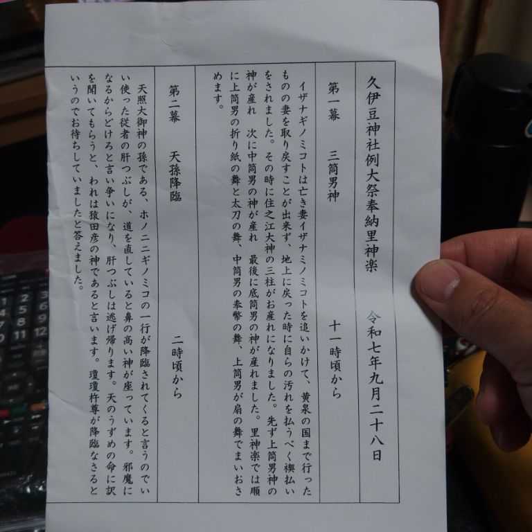 神楽の演目は神話(古事記・日本書紀)を題材に構成されています。 神話のひと場面を神楽師が演じ、神様と人が一緒にご覧になり共に楽しみます。
