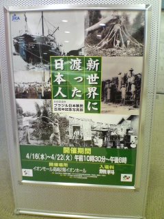 今日は高崎市にある「イオン・ショッピングセンター」に行ってきました。先週の日曜日に桜を見に行った帰りちょっと寄ったので2週連続です。というのは、先週行ったときに告知されていた「ブラジル移民100周年」展を見るために行ってきました。このブログでも何度か触れていますが、私の奥さんが日系ブラジル3世なので私自身も「移民」について興味があって、以前初めてブラジルに行ったときに彼女のお祖母さんが1世なのでお話をぜひ聞きたいと思っていたのですが、その時はもう90歳を越えていたために詳しいお話を聞く事が出来ませんでした。昭和初期に地球の反対側まで移民したのは、それなりの理由と葛藤があったと思うし、昭和初期の移民の暮らしは想像を絶する程過酷であったということぐらいは知識として知ってはいますが、1世の方に聞いてみたかったのです。だんだん1世の方が少なくなっているので、これからもっと難しくなるでしょうね。今日見た「移民展」は1908年に神戸港から渡った時から現代までの写真が多数飾られていて、傍らでは移民の生活を映像で紹介していました。昭和初期の日本では日々食べる事もままならない生活をあきらめ、新天地「南米」に夢を抱きながら渡った多くの日本人が強いられた生活は、行く前には想像もしていなかった過酷な労働をまるで「奴隷」のようにさせられたそうです。それでも日本人は賢いのでその生活から抜け出し、多くの日本人が成功を収めたそうです。現在のブラジル社会の中で日系人の力なくしてブラジル経済の発展は無かったと言っても過言ではないと思います。それでも最近は賃金の額が違う日本へ移民した人以上の日系人が日本に「デカセギ」として来日しているのは皆さんもご存知だと思います。まぁ、以前は単なる「デカセギ」でしかなかったのですが、最近では永住権や中には日本国籍を取得したり、家を購入したりと「デカセギ」から「定住」へ、そして「永住」へと変化しているようです。私の知り合いの日系人も「日本の方がブラジルより5倍以上の月収と子供の生活環境・安全を考えると日本で暮らす」という人も少なくありません。彼らと日本人である私たちが共存できる社会になってほしいと願っています。まだまだ差別感がある地域も確かに存在しているのです。ブラジル移民展の告知ポスターまたブラジルへ行きたいといつも思っている私なのです。