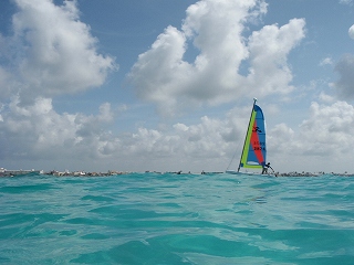 ここ最近、お仕事も落ち着いているので、休みの機会に久々に海に出てきました折角の海、沖まで出ようって事でホビーキャットに乗る事に。っても、私はまったく動かし方なんて知らないので乗ってるだけですけど・・・。ホビーキャットは、ヨットと一緒で風の力だけで動くので気持ちイイ~~すぐ足もとには、海のブルー空も真っ青で、たまたま虹もうっすらと・・太陽の周りに出てるしメッチャ暑くても、海まで出ると風もあって最高ですで、海から上がってから、やっぱりビール置いてあったのは、コロナの170MLちっちゃ~~って、思ったけど良く見てみると『コロニータ』って書いてある。~~ニータとかって、スペイン語で可愛いらしい感じの時に使ったるする。なので、可愛いコロナって感じ。あまりにも可愛い瓶なので、そのまま持って帰ってきました。今度、普通のコロナとコロニータで写真でも撮ります。海見ながら、ハンモックに寝て、ビール・・・・。やっぱり、ここはリゾート地って事に改めて気づいた1日でした↓ちなみに、こっちではパーティーヨットのセールに人がぶらさっがてるの見えますか??海から、風の力で上まで上がって、そこからみんなジャンプするんです。すごい楽しそうだけど、失敗してる人は痛そうリゾートならではの遊び方だなぁ~って感じです。