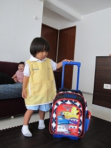 だ~~いぶ、ご無沙汰しております。前の更新はいつだったか。。。。もう、メキシコへ戻って1ヶ月近かったりして。そして、いきなりですが。。今日は藤丸の誕生日☆3歳になりました!まだ、3歳か~~というのと、もう3歳か~~と両方の気持ちがあるけれど、いままで大きな病気も怪我もなく元気そのもので過ごせた事、家族も1人増え大変だけれどその分、喜びや楽しみが増えた事に感謝です。毎年の事ながら、この藤丸の誕生日あたりはパパは仕事に大忙しで、今年も休みなく頑張ってますが、おかげで藤丸の誕生日はいつもジミ~~になってしまいます。とりあえずは、プレゼントは買ったので夜が楽しみ♪実は、この9月から藤丸も幼稚園に行き初めました☆本当は、8月の最後の週あたりから正式な新学期が始まるんだけど、やっぱり日本から帰ってきてスグはずっと行ってるキッズもまたイヤイヤ言うし、しかも車が修理中で車も無かったし。。で、なかなか準備が間に合わず、ようやく9月から行きだしました。なので、今日は誕生日で幼稚園で皆にお祝いしてもらってケーキを食べるそう。もちろん、ケーキは親がお届けするんだけどネ。。ジュースやコップ&お皿、そして何故かケーキを取り分ける三角のナイフ?も持参。幼稚園入ってスグのお誕生日だったけど、大満足で帰ってきたので良かったです。さて、イロイロ書く事はあるのになんだかPCに集中して向かう時間が作れない~。もう少しUPできるように頑張ります。写真は、幼稚園のユニフォーム。可愛らしい感じの制服です。 後ろの藤真がメッチャ笑顔。。