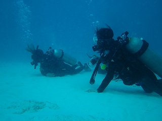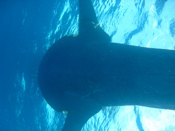 先週、元スタッフのAさんがカンクンに遊びにきてました♪去年9月に来たばかりなのに。。。嬉しい事です☆って事で、一緒になって遊んでました。だって、こういう時じゃないとなかなかネ。で、今回はダイビングをするって事で藤丸さんをAさんのママ達に預け。。ダイビングまで参加させてもらっちゃいました。2年ぶり~~~~♪けど、周りはダイブマスターにインストラクター、経験豊富な人ばっかだし。何があっても大丈夫???そんなんで、行ってきたダイビングは目当ては『サメ~~~!!』『シャーク・ダイブ』この時期はギリギリだったけど、まだ見れるって事でこの季節もの。楽しんできちゃいましたよ☆場所はカンクンから1時間くらいのプラヤデルカルメンからボートでスグ。ホントにスグ。。。。え・・・ビーチ見えるんだけど。。。こんなトコにサメ居ていいの!?って場所。で、一気にエントリー。大体、25M。心配してた耳抜きもまぁ大丈夫。で、サメさんのテリトリーに入ったらとりあえず地面にひっついてって。って事で観察チュ~~~。そしてやって来たサメは。。。。前に飼ってた猫に似てる~~~。デカイ&丸々のサメさん。けど、サメの顔してるよ~~~~。←当たり前だけど。。やっぱりジンベイとは違う。迫力が。25分くらい下に居たらしいけど、一番の感想は寒かった~~~~。けど、無事にサメも見れたし。藤丸もイイ子にしてたみたいだし。久々のダイビング。楽しかったです♪ちなみに今回見てきたサメはブルーシャークというらしい。人は襲わないから大丈夫って。まぁ。。。自然の生き物だからわからないけどネ。