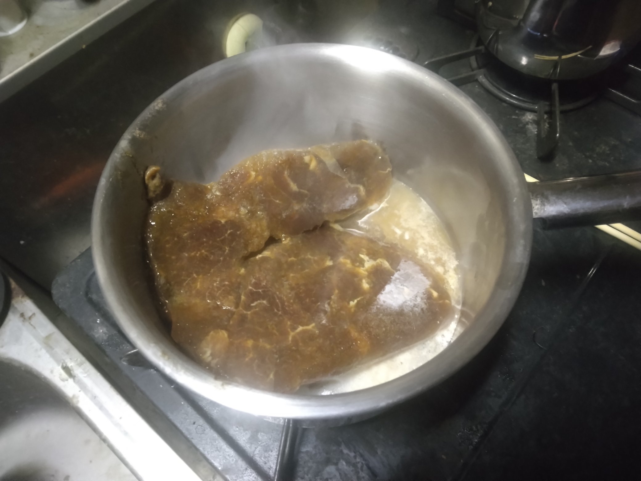 こんばんは。 今夜は羊肉(ラム)を使った料理を。 夕方、晩ごはんの買い物に行こうと思ってたら雨が降り出したので、急遽、冷凍庫にあるラムを取り出しました。 本当ならフライパンで焼けばいいのですが、あいにく我が家にはない……とりあえず、鍋で煮てみました。「底が焦げないように」と水を足しておいたのですが、 凍っていた肉が溶けると、「あ、水多すぎやん」となる。 仕方がないので、しばらく煮詰めていました。 しばらく経ってもあんまり水分が飛ばないので「あぁ、もういいや」と器に盛ります。 なんか、スープみたいになりました。 食べてみます。 まぁ、食える。不味くはない。 ただ、ラムのアクが全部汁に逃げてしまったようです。 スープはまぁ飲めた。これも不味くはない。 結論から言うと、「フライパン買え」でした。 スープの方向を極めて、「次は水分少な目」とか「玉ねぎを入れればワンチャン」とかも考えましたが、やっぱり僕はジンギスカンが食べたいな。 ジュージュー焼いた肉を頬張りたい。 まだ在庫があるので、次までにフライパンを確保しておこうと思います。 それではまた……。にほんブログ村