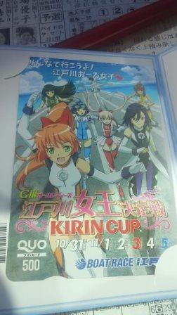 文化の日に江戸川見参!!オール女子を開催中ということで、スケベ心も手伝って、友達に誘われるまま出かけたが…結果は惨敗…予想よりも、やっぱり、好みの女子選手を選んでしまうので、勝負に徹しきれなかったよ。 でもいいこともあった。 クレープを食べて、ガチャに挑戦したら、プレミア物のクオカードが2枚も当たったよ。 クレープを売っていた女子選手とも握手してもらった。中澤宏奈選手だとは、後で知ったのだけど…中澤選手、その日は江戸川は出場してなかったけど、もし、走っていたら、単勝でクレープ20個分ぐらい買ってたかも。(笑) さて、そろそろ競馬の予想も始めないとね。