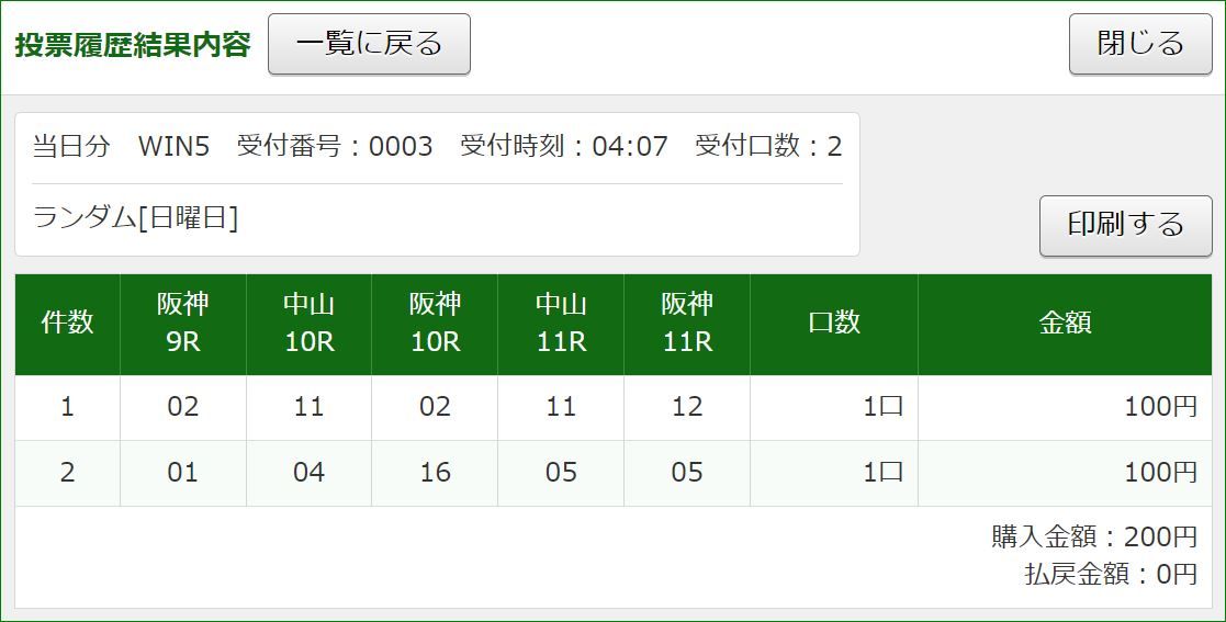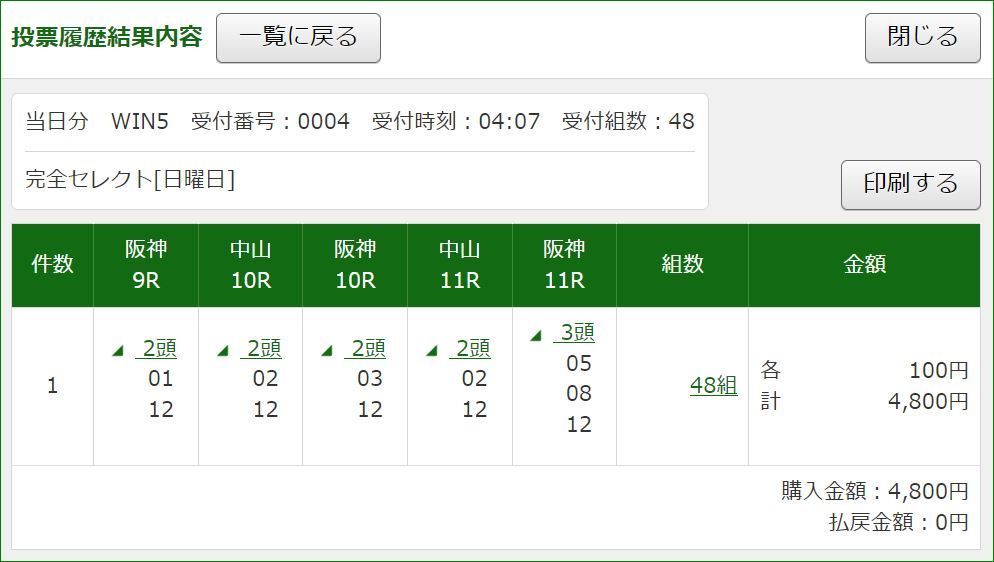 WIN5で目指せ50万円! 予想と結果、仲間とのメールの記録。