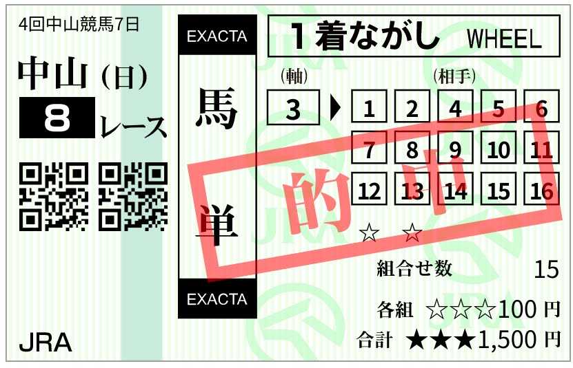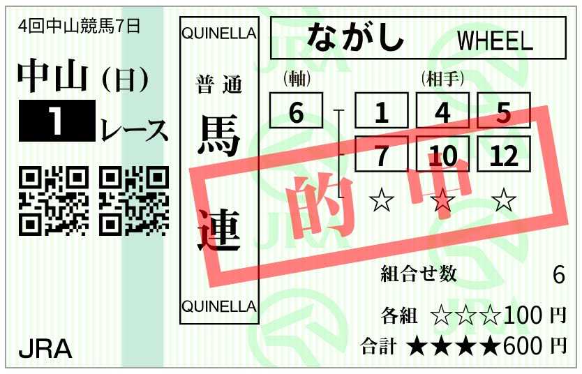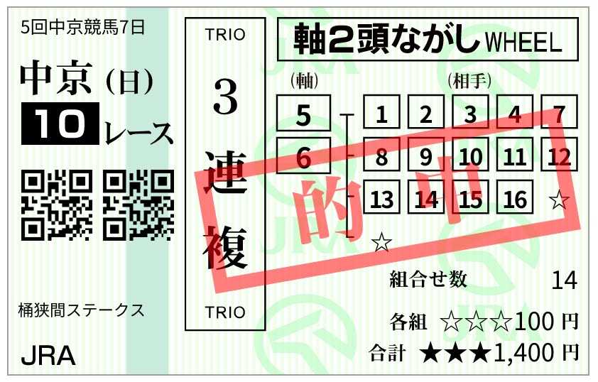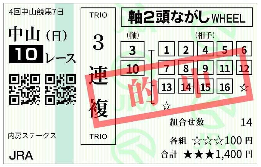 | 通番 | 中山 9R | 中京 10R | 中山 10R | 中京 11R | 中山 11R | 購入金額 | 払戻単価 | 払戻/返還金額 |