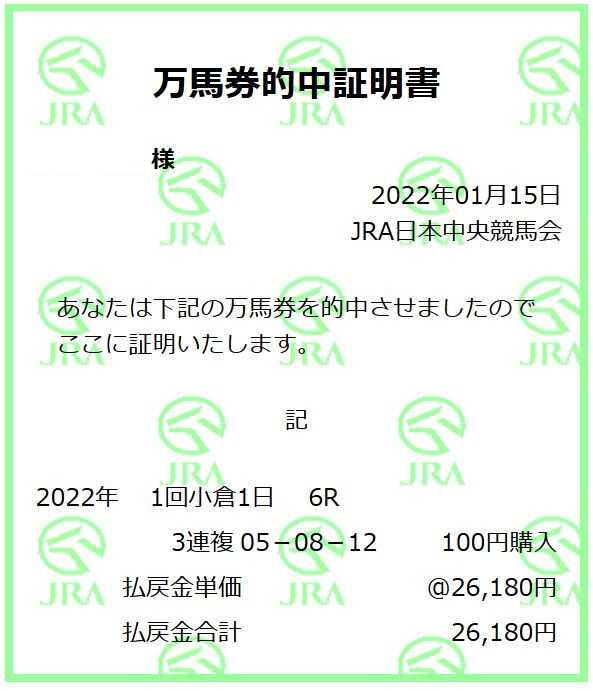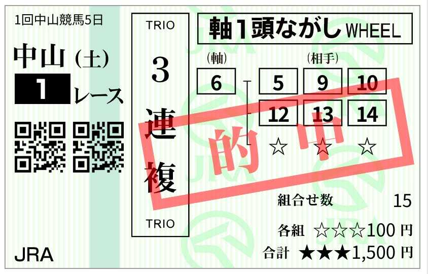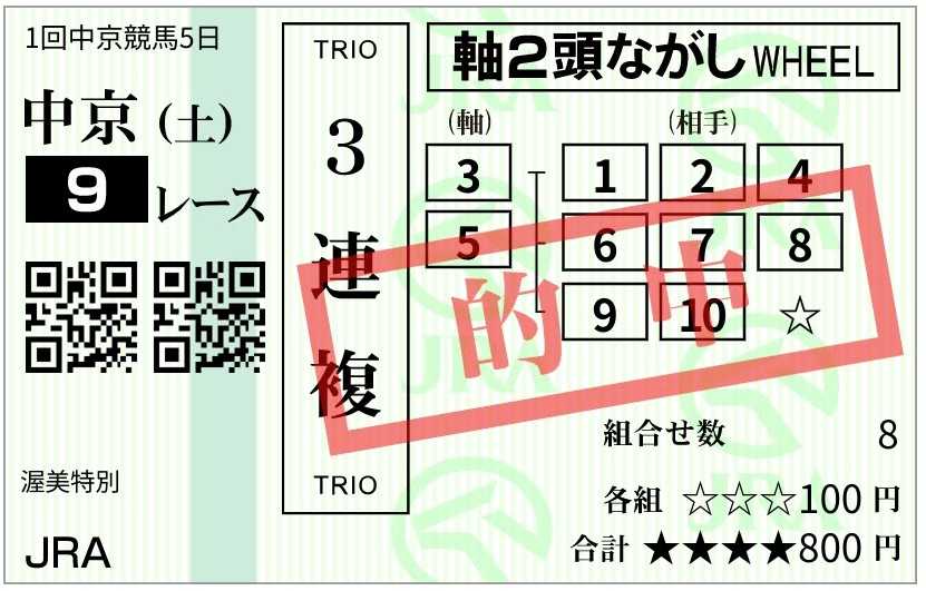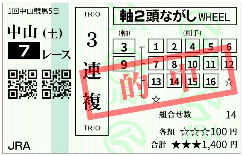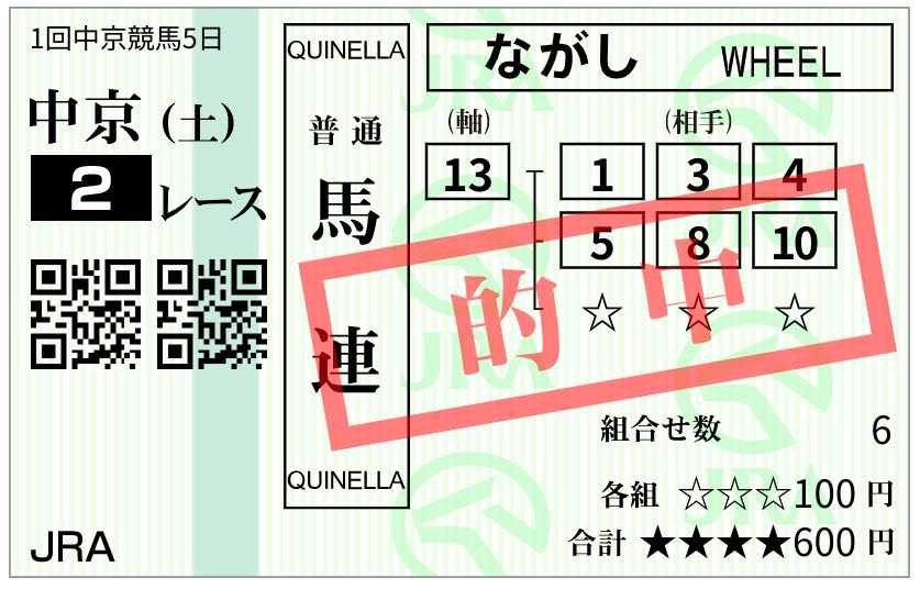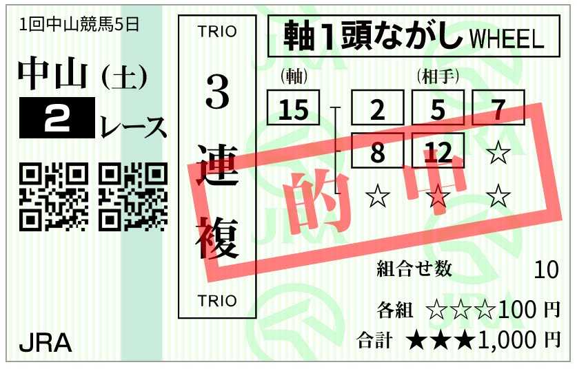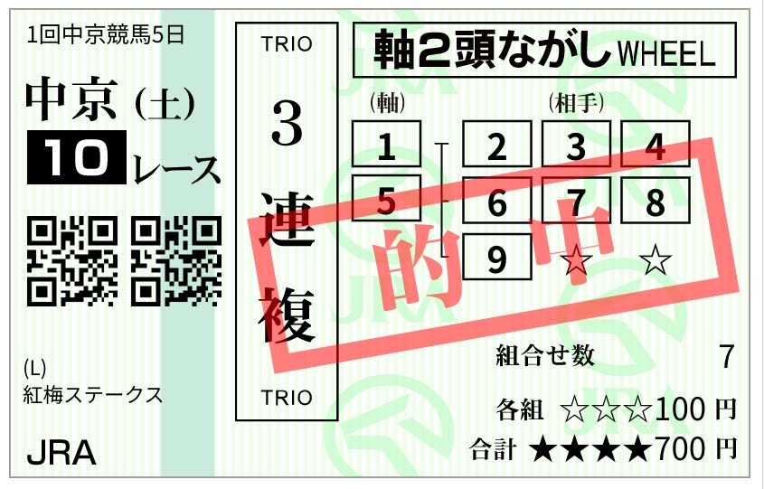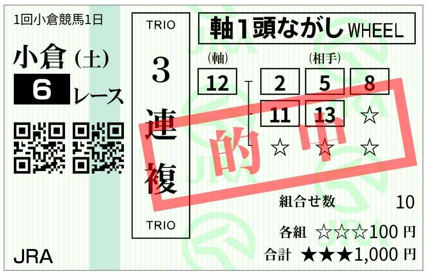 | 通番 | 中京 10R | 中山 10R | 小倉 11R | 中京 11R | 中山 11R | 購入金額 | 払戻単価 | 払戻/返還金額 |