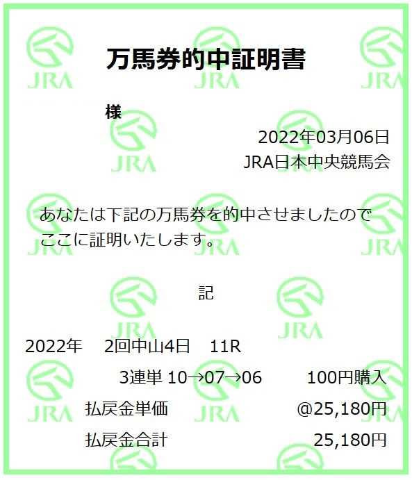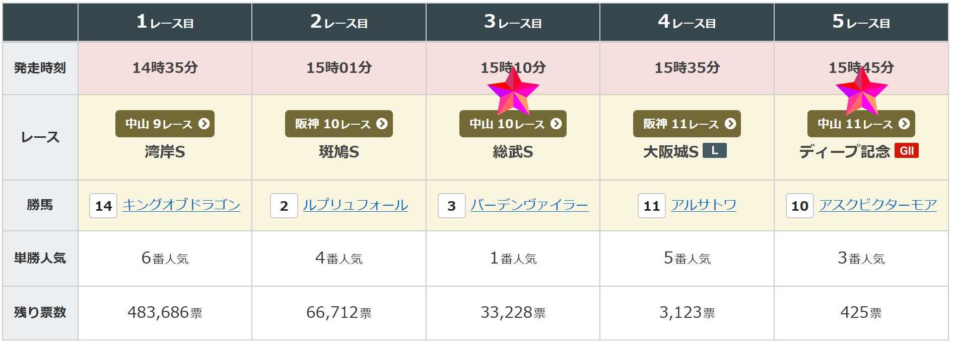 | 通番 | 中山 9R | 阪神 10R | 中山 10R | 阪神 11R | 中山 11R | 購入金額 | 払戻単価 | 払戻/返還金額 |