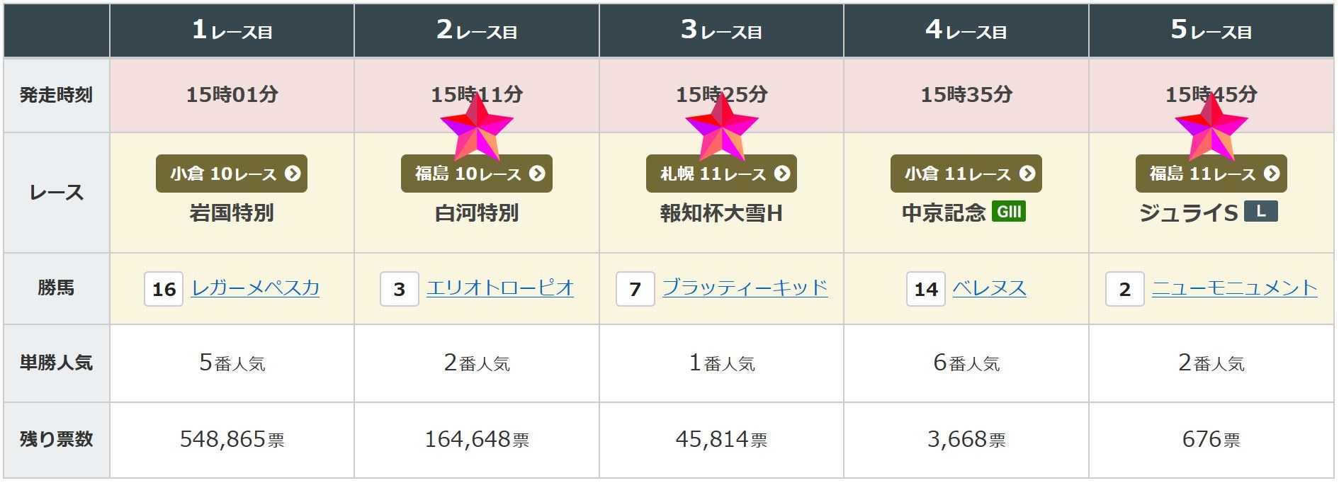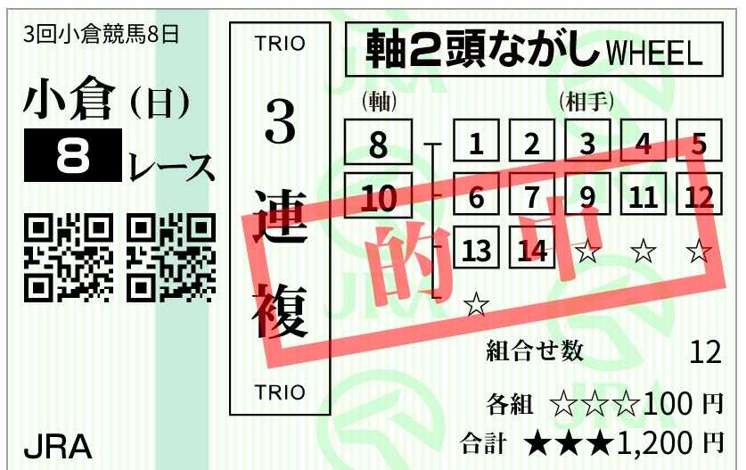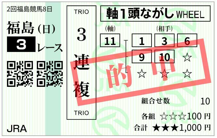 | 通番 | 小倉 10R | 福島 10R | 札幌 11R | 小倉 11R | 福島 11R | 購入金額 | 払戻単価 | 払戻/返還金額 |