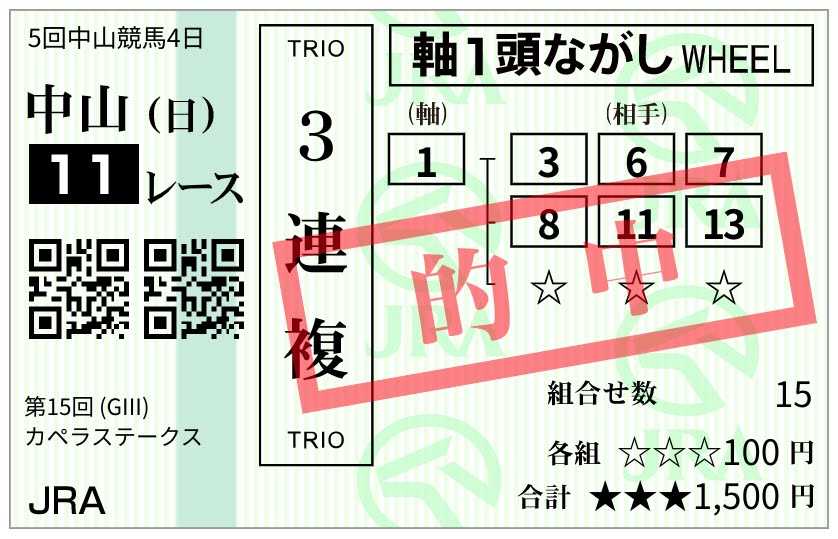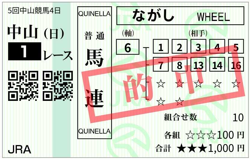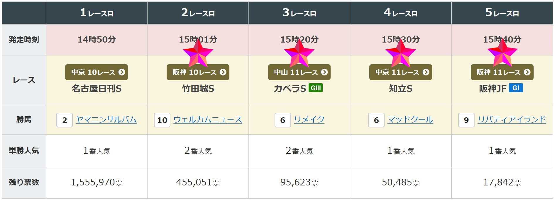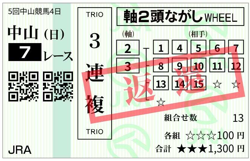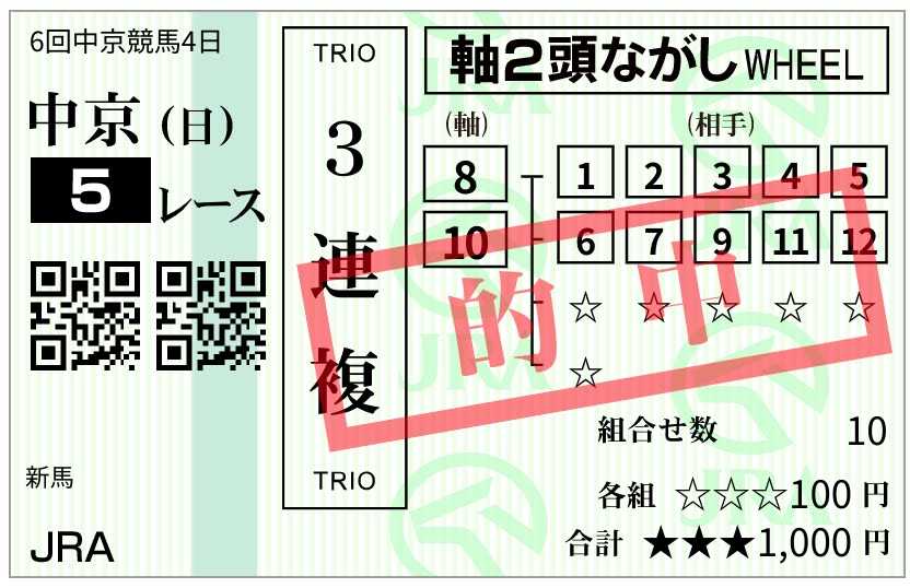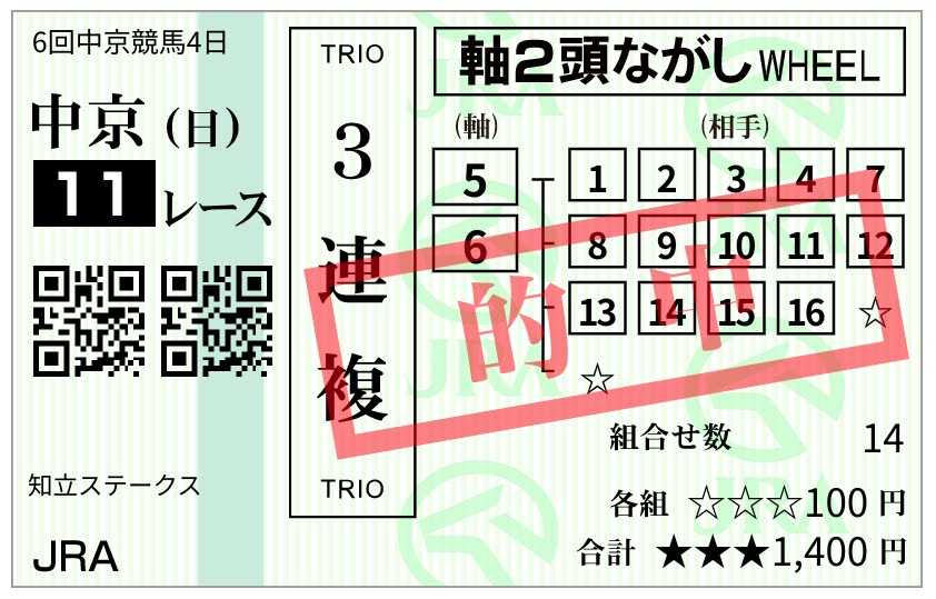 | 通番 | 中京 10R | 阪神 10R | 中山 11R | 中京 11R | 阪神 11R | 購入金額 | 払戻単価 | 払戻/返還金額 |