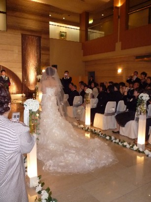 友だちの結婚式に行って、もう一週間・・・早いなぁヾ(;´▽`A``アセアセデジカメに撮りっぱなしだった画像を整理しました。まずは挙式新婦とお父さんの入場ホテルのロビーでの人前式だったんですが・・・玄関・フロントの近くとあって煩かった宿泊客のおじいさんが、せっせと携帯で撮ってたけど、他の人たちも、チョットの間でも黙って見守って欲しかったですそれにしても美しすぎる花嫁さんでした元々細い子で、普段はナチュラル・・・いや、ほぼノーメイクでメガネっ子の彼女なんですがそれはそれはもうモデルさんのようでした元が良いとはれるんだよねぇ正面から見たらマーメイドドレスで、体のラインがバッチシ胸をタオルで調節されたんだよ~~と嘆いてたけど^^;披露宴会場に移動したら、隣の会場ではなにやらイベントがあっててこれもまた賑やかヾ(;´▽`A``アセアセ他の階でも結婚式があっていました。ホテルの結婚式は仕方ないですよね(^^;)テーブルのお花高砂のお花もこんな感じで、ぶわぁ~と飾ってありましたキャンドルサービスではなくて・・・オイルみたいなのを注ぐと、発光するシロモノその時の新郎新婦の後ろ姿あら。旦那くん、黒い衣装で消えてしまいましたね~(^^;)背が高くて落ち着いてる感じで、新婦より年下には見えませ~ん花嫁さんの衣装が、これまた素敵でしょ~上品なピンク色のドレスに茶色のお花があしらってあって、お姫様みたいでしたぁ彼女のように細くはなれないけど、努力せねばと思いましたね( ̄∀ ̄*)と思った傍から、ご馳走をしっかり頂いてきましたぁ