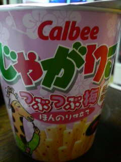 昨日の仕事帰り、チョット用事があってコンビニへ。用事が済んだらサッサと帰ればいいのに、店内をグル~っとひと回りして買っちゃいました( ´艸`) 【じゃがりこ つぶつぶ梅 ほんのり仕立】お菓子断ちしてたんじゃなかったっけ???ヾ(;´▽`A``アセアセほんのり仕立というだけあって、梅の味は微かにあるぐらい・・・普通のと大して変わらないと思いました。普通のポテチより、じゃがりことかの歯応えのあるのが好きなんです昨日は日頃の夜更かしが祟ったのか、10時半には意識不明気付いたら1時半でした(爆)いやぁ~大爆睡でしたO(≧▽≦)O これからはもう少し早く寝るように気をつけようと思います