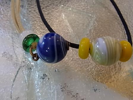今日は相方とお出掛けしてきました 以前から密かに気になってたお店に付き合ってもらいましたよ地元TV各局でとりあげられてるお店で、見る度に『行きたーい』という思いが強くなって、 ようやく念願が叶いました『長崎とんぼ玉工房 ころころ』と言う所です ショッピングモールと駅の間にある大通りに面した場所の、小さなお店体験は事前に予約が必要ってことだったので、今回は無理だと思いながらどれにしようか、商品を物色してたんですね可愛いなぁ~凄いなぁ~と、しきりに関心してたらオーナーさんが 『体験もできますよー』と 願ったり叶ったりですっ( *´艸`) 丸い玉になる分の色を決め、柄になる分の色を二色決めて・・・ これが最初の試練(爆)組み合わせた色がどういう色合いになるのか、そもそも何色の玉を作りたいのか・・・ あれこれ迷いながら、いざ挑戦 ガラス棒を溶かして、それを巻き取って、それに柄を作る工程をオーナーさんと一緒にしました。 何が何やらと思ってるうちに出来上がりました525円追加で自分でも作ることができるんですが、たった今やったのに思い出せない確か・・・こうやって、こうして・・・と作っていったんですが ぐるぐる巻き巻き柄になりました~30分冷やした後、何にするかを決めるんですが、コレもまた悩み・・・そしてようやく出来上がりました青はオーナーさんと作ったやつで、黄色が自分で作りました。 そもそも黄色は真ん丸じゃなくて、楕円??(*≧m≦*)青はベージュの皮紐に通してネックレスに。黄色は髪ゴムにしました。 紐もチェーンになったやつや、チョーカーみたいなのが色々とあって本当に悩みまくりセンスの良い人ならオリジナルの商品が出来るんでしょうけどね^^;相方の作品はこちらストラップと髪ゴム。髪ゴムの方は水玉柄にしようとしたんですが、犬に見えません上の画像はオーナーさんのとこから貰ってきたヤツなんですが、帰宅してからも自分で撮ってみました(*≧m≦*)でも不恰好だけど、味わいがあって良い感じかな見れば見るほど愛着がわく~ 二度と同じ柄は出せない、世界に一つだけの物となりましたぁ( *´艸`)また行きたいないや、行くだろうな( ̄∀ ̄*)